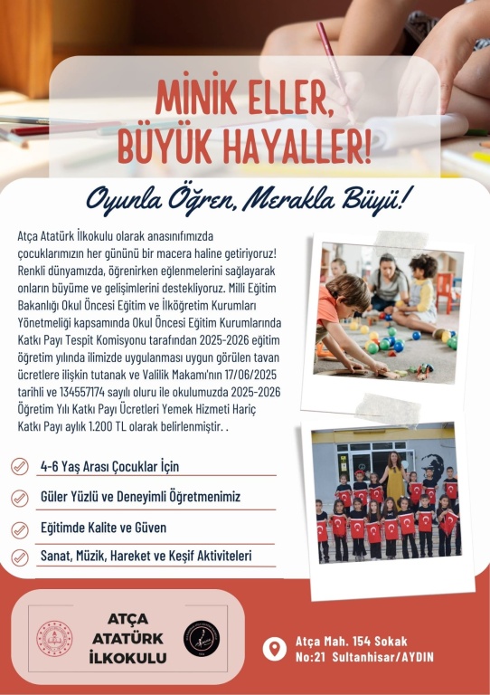 Okul Öncesi Eğitim ve İlköğretim Kurumları Yönetmeliğinin 67.maddesinin 1.fıkrasında "Okul öncesi eğitim hizmeti resmî okul öncesi eğitim kurumlarında ücretsizdir. Ancak okul öncesi eğitim kurumlarında çocukların okulda geçirdikleri süredeki temel ihtiyaçlarını, öz bakım süreçlerini ve eğitim programının uygulanmasını desteklemek amacıyla katkı payı alınır." Hükmü gereği kurulan okul öncesi katkı payı komisyonlarınca belirlenen 2025-2026 eğitim öğretim yılında ilçelerimizdeki resmi anaokulu ve ana sınıflarında uygulanacak aylık tavan katkı payları Valilik Makamının 17.06.2025 tarih ve E-66329276-841.01-134557174 sayılı onayı ile yürürlüğe girmiştir.